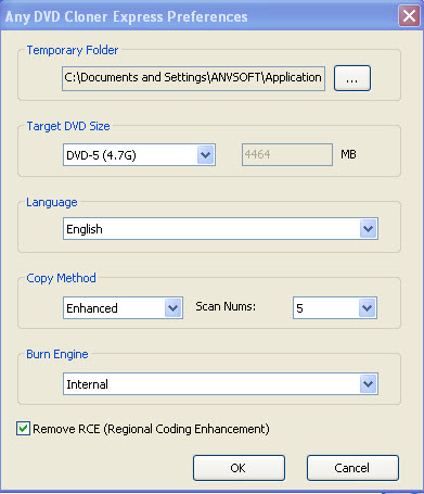 Run Any DVD Cloner Express, and click Preferences on the upper right window to set Temporary Folder location, choose Target DVD Size (DVD-5, DVD-9 or Customized Size), etc.